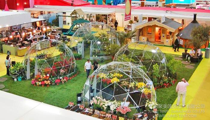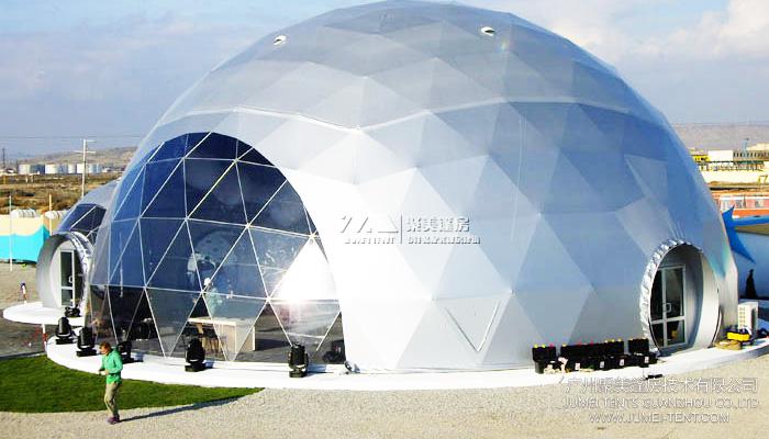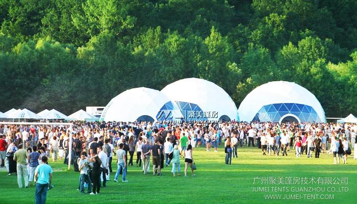 因为球形帐篷的建造对场地的要求相对简单,只要有一块平整坚硬的场地就行了。同时因为它是装配式的帐篷,不管帐篷大小都是组装装配而成的,不仅不需要大兴土木,而且还能循环使用。所以很多商家在外做商业活动时都会选择球形帐篷。