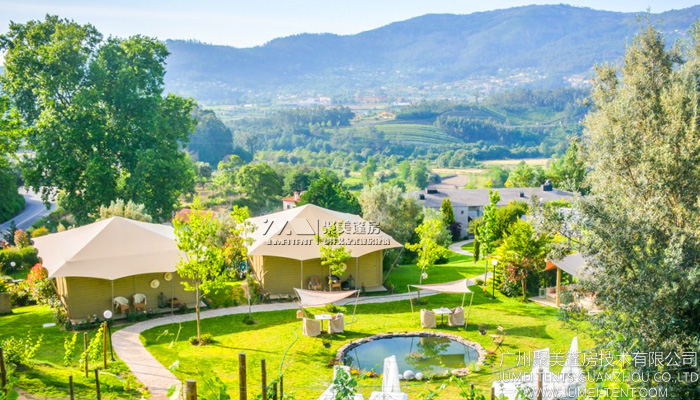 帐篷酒店采用模块化的设计,所有的构件都是在聚美篷房厂家内预制而成。大多数帐篷酒店都是采用镀锌钢管为框架,加喷涂耐候粉作防腐处理,使用寿命约为12~20年。篷布则为PVC材料膜材,可以根据客户要求定制不同颜色与图案,具备防水,防火,防紫外线等功能,完全可以适用户外各种环境。而且整个搭建过程一次到位,不需要二次搭建,不会破坏环境,可以快速搭建并投入使用。在时间,成本,环保方面都大大领先于传统土木钢筋建筑。